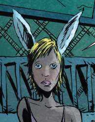 (Sweet Tooth #3, 4) - Becky, her friend Lucy, and other young women hid in the motel where they were forced to work as prostitutes by pimps Jacob and Susie. Jepperd and Sweet Tooth wandered into their motel. Jepperd was a hunter, and Sweet Tooth was a hybrid boy with deer antlers whose parents had died from the sickness, leaving him alone in the world until he met Jepperd. Jacob and Susie ambushed Jepperd and Sweet Tooth at gunpoint. They explained that Becky wore bunny ears because some of their clients had a fetish for hybrids, and wanted to take Sweet Tooth to exploit him. Jepperd was sickened, and guaranteed he’d kill them where they stood if they didn’t let him and Sweet Tooth go on their way. Jepperd made it clear he wasn’t afraid to die, and the pimps let him and Sweet Tooth go. Sweet Tooth badgered him to help the young women being abused by Jacob and Susie, and Jepperd begrudgingly returned to the brothel, beat Jacob to death with the butt of his rifle and started strangling Susie. Lucy, who’d suffered at the pimp’s hands, convinced Jepperd to let her finish the job by shooting Susie in the head. Lucy asked Jepperd to stay on, and he reminded her that she and the rest of the women were now free. Lucy said they had nowhere else to go and no other way to survive. Jepperd said they were headed to the Preserve, where all hybrid children could live safe lives, and Becky warned Sweet Tooth that there was no such thing. Sweet Tooth and Jepperd rode off, and when Sweet Tooth asked why Becky said there was no Preserve, Jepperd replied that she was probably lying because she wished she was going to the Preserve too. Sweet Tooth said that even though he’d seen Jepperd hurt people he knew he was a good man because he only did that to protect others, and Jepperd was almost overwhelmed by feelings of guilt.