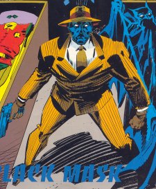Powers: Black Mask was armed with an automatic, but he preferred to have his False Face Society do his fighting for him. His psychosis gave him an eerie charisma, and made him a natural leader. One of his favorite methods of murder was affixing a mask coated with poison to a helpless victim.History: (Batman #386, 387, Detective Comics #553)-Heir to the Janus Cosmetics fortune, Roman was a troubled soul since his birth, when a doctor dropped him on his head. His parents were friends with the socialite Wayne's of Gotham, and Bruce Wayne remembered Roman as a distant boy whose emotions were always masked. His only interests seemed to be setting fires and playing with small animals. As a young man he started a relationship with a cosmetic model named Circe. His parents disapproved, and soon after they died in a fire of suspicious origin. Now the owner of Janus Cosmetics, he bought a house with Circe and started an obsessive collection of masks, ranging from archaeological relics to plastic Halloween masks. He then announced a new line of foundation named "Facepaint." This new product functioned more as a mask than as makeup, and sales were dismal. A completely waterproof makeup was marketed to recover from the loss, but the product was not thoroughly tested first. Users were affected with scars, rashes, and worse. Lawsuits piled up, and bankruptcy was inevitable. Bruce Wayne bailed Roman out, buying the company but putting in new WayneCorp-appointed executives. Circe then left the destitute Roman, and he was now a man alone with his masks. Roman went to his family crypt, smashed his father's coffin, and carved a dark mask from a fragment of the lid. He declared Roman Sionis dead and reborn as the Black Mask. His first agenda was vengeance, and he gathered a small army of criminals as his False Face Society of Gotham. One by one, they executed WayneCorp executives of Janus Cosmetics, and their ultimate target was Bruce Wayne. This inevitably led to Batman II fighting Black Mask. They met at the Sionis family home, and it caught ablaze in the battle. Batman rescued Black Mask, but found that the image of the ebony mask was now burned into his face. Black Mask was then taken to Arkham Asylum.