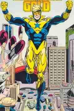 (Booster Gold #1) - Soon after his arrival in our time, Booster foiled a plot by Chiller and the 1000 to kill the President and Vice-President of the United States. Using the publicity this brought him, he took the name Booster Gold and became a super-hero for hire. Booster also formed the corporation Goldstar, which was designed to accumulate wealth and book him as a commercial spokesman.