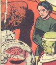 (Doom Patrol I #115, 117) - When the Chief learned that Madame Rouge had been forced into the Brotherhood of Evil by Brain twisting her mind patterns, he invented a psycho-ray to undo the damage. The ray reached all the way to Paris, and began to awaken Rouge's good side. Mallah and the Brain suspected something amiss in his compatriot, and began a booster treatment to keep her on the side of evil, reminding her that they had given her salvation by showing her a post-moral world. Rouge felt her mind unraveling, and her body coped by splitting into two entities, one good, one evil. After debating which was the true Rouge they battled, and the evil Rouge fell omn a knife and died, leaving only her good side alive. Chief rescued her from the Brotherhood's clutches. Mallah was perturbed to find that Rouge had defected, but brain assured him that the evil he nurtured in her would not sleep long.