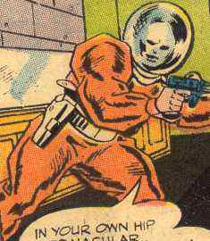 Powers: Bubble-Master uses a bubble craft as transport, capable of travelling through the air and underwater. His main weapon is the bubble gun which shoots bubbles of various functions. Plasti-case bubble: explodes on contact with a target. Vacuum bubble: traps a target. Flat bubble: concussive force. Rainstorm bubble: unleashes a torrent of water. Bubble-gum bubble: immobilizes target with sticky gum. Burn bubble: shoots flames. Parachute bubble: acts as a parachute.History: (Challengers of the Unknown vol. 1 #54)-Bubble-Master invented a bubble gun and bubble craft and set out to be a master supervillain. He tracked down the nefarious Villo and asked to become his apprentice. Bubble-Master turned into a fawning dolt when he met the man he had idolized for so long. Villo told him he had to prove himself by taking down the Challengers of the Unknown. Bubble-Master robbed a jewelry store and bested the Challengers, earning himself a trial-run as Villo's assistant. Together they engaged the Challengers in a dogfight pitting the bubble craft versus the Challengers' Gallopin' Gizmo. Villo quickly tired of Bubble-Masters friendship, and threw him from the craft. Bubble-Master saved himself using a parachute bubble, and despite the abuse he still worshiped Villo. He later helped Villo break out of prison and finally earned his place as an assistant supervillain.