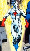 Powers: Captain Atom possessed quantum senses that gave him godlike powers. He saw all of time and space, could travel through time, rearrange atoms to transmute, deconstruct or construct virtually anything, and teleport.History: (The Multiversity: Pax Americana #1) -In a government attempt to create a superhero, directed by Governor Harley, Captain Allen Adam was suited with the met material Dilustel, and exposed to the unstable element U-235. The scientists in charge of the experiment also secretly placed an artificial black hole in Adam’s head, at the orders of Sarge Steel‘s superiors. He gained godlike powers over which he had little control, and was driven near madness by his ability to see into all of spacetime. Harley was overjoyed and requested a meeting, despite Adam turning government men that approached him into metal. The scientists that created him brought his pet dog Brutus to him, hoping to jar some memories. He saw Brutus from a purely materialistic point of view and separated the animal’s anatomy. He felt remorse, and created another Brutus, but said it wasn’t the same. Harley took him for a walk, telling him that he’d found Algorithm 8, the mathematical solution that would bring peace to the world, and explain the structure underlying the universe. He’d seen the unavoidable future of a world in chaos, with death camps at the end of history, and he knew Adam saw it too. He’d come up with a plan to save humanity, but knew it was impossible without a real superhero, Adam, who he rechristened Captain Atom. He needed the ultimate sacrifice and redemption of the unredeemable tp restore the symmetry of the universe. Harley knew that he would have to ascend to President, die, and be raised from the dead by Atom. He gave Atom a stack of comic books so he could understand the gravity of the situation. Atom traveled back in time to inspire the young Harley, and teach him the secret of Algorithm 8. In 2008 Atom joined a number of costumed heroes, who, unlike him, had no powers, as President Harley’s Pax Americana. They made their public debut in NYC, where Captain Atom constructed three towers to replace the fallen Twin Towers at Ground Zero. In 2014 the scientists that created Captain Atom were tasked with destroying him. They convinced him to test a particle accelerator they intended to discorporate him. He read the DC comic Ultra Comics, and pondered how higher planes of existence saw their world. He revealed that he read the scientists thoughts like word balloons, and disappeared from the universe.