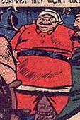 Powers: Bigg was a skilled seaman and marine biologist. He wore a fat suit to give himself a massive, intimidating appearance. He led a gang of pirates, and had a ship full of armaments.History: (Leading Comics #2) - Yates was an employee at the Marine Laboratories, and created the criminal identity of Captain Bigg, a pirate who wore a fatsuit to make himself appear intimidating. The Black Star contacted notorious criminals Captain Bigg, Brain, Falseface, Hopper and Rattler, only communicating through pre-recorded movies reels, and provided them with a flawless plan to rob a bank. They posed as city workers, and broke a water main. The hydraulic pressure wrecked the bank's wall, and they robbed it, affording their escape by changing clothes and impersonating police officers. They collected another set of movie reels, and Black Star told them he was splitting them up for their crime wave. He assured them that if they followed his instructions to the letter they'd succeed, but if they failed he would track them down and have his vengeance. The hardened criminals all agreed that they were glad they didn't have to meet Black Star face to face, because he gave them the willies. The Seven Soldiers of Victory became interested in the case, and discovered the film detailing Black Star's plans. Captain Bigg went to Key West, and posed as the Santa Claus pirate. Bigg and his crew of pirates pursued and boarded ships, and then gave away fabulous riches. The American Avengers went into action, and boarded Bigg's ship, discovering an arsenal on board. They knew he was scheming, but Bigg managed to knock them out with a mast, and tied them to the swinging hammers of a buoy before sailing off. Stripesy used his brawn to free them, and after boarding Thomas Dolan's luxury yacht, and Bigg's next stop, they convinced Dolan to allow them to hide in his safe. Biggs finally made his play, being allowed to board and revealing his Santa act was a scam to surprise Dolan, who had two million in bonds on board. He opened the vault only to find the American Avengers inside, and with the benefit of surprise they defeated Bigg and his crew. The Kidd took out Big with one punch, deflating his fat suit and revealing his frail form. Black Star had planned for his henchmen to fail all along, and was pleased at Bigg's lack of success.