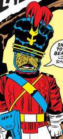 History: (Kamandi #26-28) - In the aftermath of the nuclear Great Disaster most of humanity perished, and the majority of survivors devolved into feral savages, while animals evolved intelligence. Captain Pypar was a member of the Horse Marines, and a commander in the Brittaneks, a group of bulldogs that modeled themselves after colonial British troops. Mutated ant Aborigine was his right hand man. Sacker’s Leopard-Men came to the rainforests of the Dominion of the Devils in Quebec, looting and despoiling everything in their path, and raising the ire of Pypar. Kamandi and Ben Boxer, Sacker’s old enemies, found their way into the Dominion, and were soon in combat with the Leopard-Men. Pypar stampeded insects towards them, forcing everyone to flee before introducing himself and Aborigine to Ben and Kamandi. Pypar explained that he was in conflict with the Leopard-Men because they’d violated the Horse Marines Atlantic Testament. He volunteered Kamandi and Ben Boxer as the latest recruits into the Marines, and gave them their marching orders, leading them to Aborigine’s ant-hill. Aborigine used his “look-see” power to locate Leopard-Men outside the ant-hill, so Pypar set dynamite and told his troops to march away from danger. Kamandi said they should be running, but Pypar replied that there was no breaking of ranks in his army. Outside the ant-hill they found the surviving Leopard-Men, who were occupying a well-armed citadel, running to find the source of the explosion. Pypar discovered their vast weapons cache, but some Leopard-Men guards caught them. Kamandi, Ben and Pypar were saved when Aborigine burrowed under the guards, causing a cave-in that swallowed them. Kamandi panicked, saying they were trapped, but Pypar had Aborigine use his “look-see” power to transmit images of the Brittaneks, riding to the rescue. They snuck through the citadel, observing more Leopard-Men gassing giant insects and processing their corpses in a power plant. Kamandi was disgusted to see a virtual Eden ruined, but Captain Pypar reminded him the cavalry was on the way, and pointed to the Brittaneks arriving. Other armies arrived and Pypar met with his commanding officer in the Brittaneks. Kamandi kept piping up, which was not appreciated by the CO, so Pypar sent him and Ben away. Kamandi and Ben explored the newly set-up army barracks, with Kamandi wishing they could extricate themselves. Aborigine’s presence annoyed Kamandi, who compared him to Gunga Din. In the barracks Kamandi red up on the Brittaneks, Germaneks, Napoleoneks, Garibaldeks, Spandars, Greks, and Torks, who formed the Band of Brothers or Nations of the Atlantic Testament Orders. They were divided by animal species, with each army having modeled themselves on a different pre-Disaster national army, and Kamandi realized they’d drawn their inspiration from a garbled version of world history. NATO laid claim to the Dominion of the Devils, and put it under their protection, explaining their conflict with Sacker’s Company. Pypar kicked them out of the barracks for snooping, and Kamandi got increasingly frustrated, saying the Great Disaster changed nothing, and that animals had adopted all the bad behaviors of man. Ben and Kamandi admired the parts of the rain forest not ruined by the Leopard-Men when they spied the Leopard-Men building up their defenses in preparation for war with NATO. Ben started ripping up their artillery, and he told Kamandi to flee. NATO approached, but were being butchered by the Leopard-Men. Unable to watch anymore senseless carnage, Kamandi stole a Leopard Man’s gun and aimed it at their ammo, acting like the animal they all thought of him as, and threatening to blow it sky-high. The panicked Leopard-Men broke ranks, and Captain Pypar chided Kamandi for not following command, but commended him for leaving the Leopard-Men vulnerable. NATO rode on the fleeing Leopard-Men, gaining the advantage. Ben and Kamandi were pleased with themselves, but decided to walk away from the whole mess.