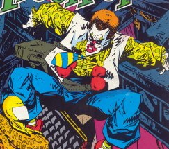 Powers: Cosmic Clown’s android body can survive in the void of space, and can keep functioning after extense amounts of damage. His eyes are equipped with infra-red scanners that can identify a target and calculate the best way to deal with them. He utilizes a number of weapons including anti-grav floppy shoes, a constrictive kazoo, and exploding sparkler balls. He can also shoot lasers from his fingertips.History: (Heckler #3)-Cosmic Clown was originally one of a number of interstellar android clowns that were employed as assassins. Cosmic Clown attempted to kill Prince Konshu of the planet Rotcod, but a bodyguard shot him in the head. Cosmic Clown drifted into space and spent years recuperating from the damage. He decided to reprogram himself, and escape his past as an assassin. As a result of this, his clown colleagues wanted him dead, so he fled to Earth. He landed in Delta City, but believed that the earthling clowns he encountered were the same as his former android friends. When he saw an advertisement for a clown show at the Breeding-Mosley Circus, he decided to eradicate them to atone for his past. He met the Heckler, whom he mistook for yet another clown. They fought, and Heckler knocked his head off with a baseball bat. Cosmic Clown was relentless and continued to pummel Heckler with his decapitated head. Luckily a nerd named Bob showed up, who believed Cosmic Clown was a character from his favorite sci-fi show, Quest-Vision. Bob’s toy rayblaster somehow incapacitated Cosmic Clown, and Bob took the head home as a souvenir. Cosmic Clown’s head is currently living in Bob’s apartment, and the continually get on each other’s nerves.