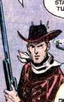 History: (Batman I #330) - Cowboy hated Batman for putting away his pappy when he killed the Cooper Clan during a blood feud. His pappy died in prison and Cowboy swore revenge, spending years training until he became a deadeye with a pistol or a knife. Death row inmate put a ten million dollar bounty on Batman, the man who put him away, and Cowboy told his sister he knew it was time for vengeance. Several would-be bounty hunters went after Batman, and Cowboy got in a confrontation with “Big” Mike Frawley and his men, who didn’t appreciate outside competition. Cowboy coolly gunned them down. Batman was worried about civilians getting caught up in the crossfire, and announced that he was going to be on Grosvenor’s Island, waiting for any and all would-be bounty hunters who wanted him. Batman fought several criminals, including Blackjack and his biker gang on the island, but had to leave when a transmitter he’d placed on gang member Ronald Watkins, who was trying to blow up the Wayne Foundation, went off. Cowboy tried to get the drop on Batman and Robin at the Wayne Foundation, but his normal unerring aim was useless against their acrobatics and they defeated him.