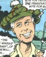 (Demon III #27, 29) -The demon Etrigan, backed by conservative Darrin W. Dingle’s think-tank The Right-Wing Legacy Institute, ran in the Republican Party presidential primaries. A reporter asked Vice President Dan Quayle about Etrigan running against President Bush, and the confused Quayle said the President should vote for Bush and then forgot exactly what the reporter was asking him. Etrigan soared in the polls, and Dingle’s think tank started a rumor that Superman was a close personal friend and advisor to Etrigan, causing him to once again surge in the polls. Superman gave a highly publicized speech, denying he had any affiliation with Etrigan, denouncing his warlike ambitions, and telling the American people that he could save them from supervillains, but only they could save themselves from Etrigan. Dingle and his think tank met with Etrigan to discuss his prospects, since he no longer had a chance at the Presidential nomination after Superman’s speech tanked his momentum. Dingle rejected his team’s ideas of running as an independent or throwing in with the Democrats. Dingle had connections to the White House, and Bush was offering to dump Dan Quayle and offer Etrigan the vice-presidency if he threw his support behind Bush at the Republican Convention. Etrigan approved, making a veiled threat that he’d end up being President anyway after Bush died. Jason’s friends Glenda Mark, Harry Matthew and Randy Singh made sure Etrigan turned back into Blood and sat out the Republican Convention. Dingle nearly had a stroke when Etrigan’s speechwriter Patty Nonage conceded the nominations he’d gotten to Bush. Bush told Quayle to stop pouting because he was back on the ballot. Bush / Quayle won the Republican nomination, but weeks later Etrigan met with Superman, telling him he intended to run again in four years.