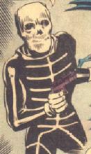 History: (Batman I #180) - Death-Man mastered yogi techniques that controlled his breathing and allowed himself to appear dead. Bruce Wayne and Dick Grayson attended a penthouse gem showing when Death-Man and his gang arrived, saying he'd take the goods because while the living couldn't take their wealth with them after death he was already dead. Bruce and dick changed into Batman and Robin as Death-Man fled the penthouse, shooting down the security guards. The Dynamic duo nabbed him, but he gloated that he was the specter of death, beyond their grip. Death-Man was sentenced to death, but told the judge he was beyond human judgment, and seemingly dropped dead in the courtroom. Batman was haunted by the grim villain, and his macabre claims, so he insisted the GCPD dig up his grave, and found Death-Man lying there. A news report soon came in that Death-Man reappeared on the scene, and had robbed and killed again. Batman and Robin caught up with him fleeing in a funeral hearse, and cornered him in a junkyard. After a drawn out battle Death-Man again told them they had no power over him, and dropped dead again. Bruce attended a socialite event where a yogi was buried alive, but unearthed unharmed because he used meditation techniques to put himself in suspended animation. Having tumbled onto the same trick Death-Man used he dug up his grave again, only to find it empty. Death-Man and his gang were waiting for the heroes, shooting at them, and promising he'd bury Batman in the grave he once lied in. Death-Man and Batman struggled over the grave when a bolt of lightning hit Death-Man, killing him, and he tumbled into the grave. Batman thought it ironic that a freak accident carried out the state's death sentence.