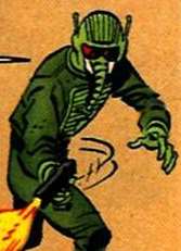 History: (Showcase #13) - Albert Desmond was obsessed with the chemical elements since an early age, and grew up to be adept at chemistry. He turned to crime, and after inventing an element gun took the identity of Mr. Element, wearing the symbol for carbon on his chest and breathing through a mask that supplied him with pure oxygen. He recruited a number of henchmen, naming them after the six inert elements since they couldn’t make a move without him, and made his hideout in a save since elements were found in rocks. His first criminal act as Mr. Element was robbing the Palladium Jewelry Store with his goons, proclaiming to the clerks that they were lucky to be present at his debut. Flash responded to the robbery, and Element said he’d not only anticipated Flash’s arrival he looked forward to matching wits with him. Flash ran into the store but was entangled in nearly-invisible strands of gold Element had strung throughout the corridor, giving him time to escape. The Harrow Company received a large supply of platinum, and Flash suspected Mr. Element would make the company his next target. Flash ran into the building after hours only to find Mr. Element waiting for him behind a wall of vanadium, which was so hard Flash couldn’t vibrate through it. Element crowed that his henchmen had already stolen the platinum, and he’d just stayed behind to show Flash was fruitless it was to oppose him. Flash rubbed the wall at superspeed melting it, then grabbed Mr. Element, preparing to take him to prison, but the criminal dropped a sodium pellet into water on the ground, causing an explosion that allowed him to escape. The next night Mr. Element made a neon sign in the sky challenging Flash to a final confrontation. Flash met him in a dark alley, and Element shot him with a blast of elemento, an element he discovered that was a form of magnetic light. The elemento made Flash shot helplessly into space, and as he escaped Earth’s orbit he feared colliding with the moon or being sent further into the reaches of space. Flash managed to catch the moon’s gravitational field and slingshotted himself back to Earth. Mr. Element was shocked to see Flash escape his trap and said he had a radium bomb in his watch, but Flash had already noticed the odd glow from his watch and slipped it off the criminal. Flash took Mr. Element to prison.