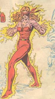 Powers: Firebrand can project fire from her hands, surround herself in a field of fire and fly. She can control any flame in her immediate vicinity, and she can absorb fire into her body harmlessly.History: Danette Reilly was a vulcanologist studying volcanoes that popped up north of the Hawaiian Islands in 1941. She was kidnapped by Per Degaton and Wotan; while fleeing through the cavern she was struck by a bolt of mystic energy by Wotan and fell into a vat of lava. Somehow she survived, and was rescued by the Justice Society of America.