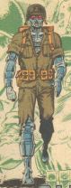 Powers: G.I. Robot could shoot machine gun bullets, miniature torpedoes and anti-aircraft missiles from his hands and flame from his mouth. He could fly using boot jets and had sonar capacity.History: <WWII> G.I. Robot was the second in the J.A.K.E. line of experimental robotic soldiers. The robot fought in the Pacific theatre and worked with Sgt. Coker, who was friends with G.I. Robot I. G.I. Robot and the Creature Commandoes were put in a rocket on a mission to berlin, but the rocket malfunctioned and they were sent hurtling into space.