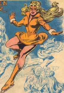 (Flash I #250, 251)-Lisa Snart, sister of the notorious Captain Cold, was a champion figure skater who performed under the name Lisa Star. She owed her great success to the spinning skills taught to her by her boyfriend Rosco Dillon, who, as the super-villain Top, was one of her brother's allies. In one fight against Flash II, the Top was accidentally killed, and Lisa vowed revenge. She adopted the identity of Golden Glider and armed herself with weapons which she stole from her brother or which had been bequeathed to her by Top. Learning that Flash was in love with Iris Allen, Golden Glider tried unsuccessfully to kill her. Flash captured her, but she later escaped prison and developed an arsenal of jewel-weapons using Top's weaponry designs. She discovered Flash's secret identity of Barry Allen and tried to kill his parents, but was again thwarted.