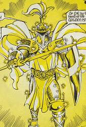 Powers: The Golden Knight was a magical construct that was the essence of Sir Percival of the Knights of the Round Table's virtue. The Golden Knight was equipped with a magic suit of armor, shield and Sword of Truth that could shoot beams of light that searched a target's heart and mind to determine if they were possessed of virtue. If the Golden Knight were to be destroyed he would soon reform unharmed.