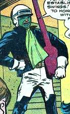 History: (Plastic Man I #6) - Plastic Man’s girlfriend Mike De Lute invited him to a band show at The Cool Cat club, despite his insistence that sudden movements made him lose control of bodily function. They started dancing, and when Plas’ body started uncontrollably flailing around the club Mike insisted that he’d invented a crazy new dance. The villain Goldzinger crashed the party, using his gold magnet to rob the club, before planting a kiss on Mike, declaring that he liked how fiery she was with her resistance. Goldzinger’s getaway plan went awry when his motorcycle got towed away, and Plas detained him by tying him to a lamppost. After he left Madam De Lute, who disapproved of her daughter’s relationship with Plastic Man, freed Goldzinger, promising him a huge cash reward if he eliminated Plastic Man. Goldzinger agreed, but realized De Lute thought he was a stupid patsy because he was a criminal, and used his magnet to rob her before boarding a plane to South America to lay low for a while. Plas was on his trail, and was waiting for Goldzinger disguised as his seat. Goldzinger squirmed out of Plas’ grasp and jumped out of the plane, but Plas was disguised as his parachute. Goldzinger landed in a field and was chased by an old farmer into a tree, which turned out to be Plastic Man. The farmer took off her mask, revealing herself to be Madam De Lute. Plas told Goldzinger he’d slipped up, De Lute would go to the ends of the earth to catch anyone who stole from her.
