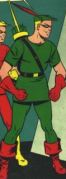 Powers: Arrow was one of the world's greatest archers and used a number of trick arrows, including ones that exploded, released smoke, nets or knockout gas, and arrows attached to with strong, thin lines. Arrow was a skilled hand-to-hand fighter and his primary means of transport was the Arrowcar.History: <1940s> Oliver Queen spent years amassing a collection of American Indian artifacts, and during his study of Indian culture became quite adept at archery. He was devastated when a fire destroyed the collection of artifacts, but Morgan, the museum curator, told him he could assemble a new collection from the Indian settlement Lost Mesa. Morgan referred to the Mesa as a gold mine of artifacts, and a nearby criminal waiter overheard just the words "gold mine" which was enough prompting for him to gather a gang of criminals and follow Queen to the Mesa. At the Mesa Queen fought of the criminals using his archery skills and aided by a young boy named Roy Harper. Queen discovered untold treasures in the Mesa, making him rich beyond his wildest dreams. He took in Roy as his ward, and together they fought crime as the mysterymen Green Arrow and Speedy.