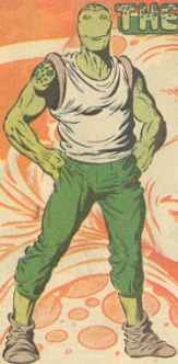 Powers: As a Green Lantern, Green Man wielded a power ring capable of doing almost anything he could imagine as long as it was recharged by his emerald power battery once every 24 hours. Examples of its' powers include flight, phasing, creating giant objects formed of energy, and force fields. The power ring is totally ineffective against anything colored yellow. After leaving the Green Lantern Corps, Green Man lost the use of his power ring. Green Man is a calm and intelligent problem solver, can breath underwater and his blood is highly acidic. He possesses emerging mental powers including telepathy and teleportation.History: (Green :Lantern vol. 2 #164, Omega Men #26)-Green Man was born on the planet Uxor, a world where society always takes precedence over individuality. Uxorans do not own possessions, or even names. Green Man was a misfit who longed for identity, and readily accepted a position of Green Lantern when he was approached by the Guardians of the Universe. He successfully defeated many threats, but was never able to overcome the Spider Guild. When the Spider Guild invaded the Vegan Star-system, Green Man allied himself with the Omega Men to push them back. In doing so he had violated a non-interference pact between the Guardians of the Universe and the Psions of the Vegan Star-system. Green Man was ordered by the Guardians to cease and desist, but he could not in good conscience abandon the Omega Men. Green Man was captured by the Psions, who performed experimental surgery on him and confiscated his Green Lantern gear. Green Man was given mental powers by the surgery, and was able to help the Omega Men defeat the Psions. He then quit his post as a Green Lantern and became an official member of the Omega Men.