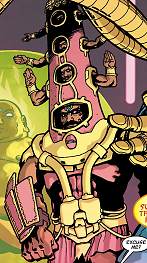 (Vimanarama #2, 3) - The fire born razed London, and Ull-Shattan captured Parliament, executing several members, saying that the fire born had no mercy for the weak. Ull-Shattan sensed the pollution and impurities on Earth, and was disgusted at what humanity let happen to the planet. He sent his underling Ull-Blizz to lead an army to continue the destruction the the UK and abroad. Ull-Shattan and several fire born traveled to drowned Atlantis to reclaim their black vimanas and doomsday weapons to eradicate humanity. Ali told his father what had happened, and he was incredulous. He said it was the end of the world and their world as well because the hole under his shop had swallowed up the entire family business. Prince Ben Rama assured everyone he would make their world whole again, while the rest of the Ultrahjadeen echoed the fire born’s sentiments about how humanity had neglected the planet to an absurd degree. Ben Rama flew off with Sofia, saying it was for her safety, as she tried to object. Rama told her how her ancestor and he were lovers, and he wanted to resume that love story with her. He promised to make her immortal and a demigod with the contents of a small vial, but Sofia said she had absolutely no interest in that. Ali and his father went to get his brother Omar from the hospital, reasoning that if it was the end of the world they should all be together. Omar said he had a severe concussion but understood perfectly what had happened. He said Ali had been given power and responsibility, but chose not to live up to it, as always, and started choking him. One of the Ultrahadeen calmed Omar down, saying Ali could end up saving the world, and Ali had no idea what she was talking about. The Ultrahadeen launched a prayer missile at London, destroying Ull-Blizz and his armies, but leaving London itself and its’ inhabitants untouched. Ali tried to profess his love to Sofia, but she couldn’t hear him over the roar of the missile. She told him that Ben Rama was delusional about being with her, but Ali just wandered off. Sofia rejected Ben Rama, and, needing true love to power him, he fell to the ground, helpless. A leaf grazed his chin and he felt pain for the first time in his life. The Ultrahdeen debated just leaving and giving up on Earth and humanity, but Ben Rama pleaded humanity’s case. Sofia rushed back to Ali’s home, where she found he’d hung himself. Ali’s spirit saw Sofia and his family cut him down from the ceiling, and he immediately regretted suiciding, but found himself in a psychedelic landscape with the sense that he was on a mission. Sofia told Ali she loved him, and gave him mouth-to-mouth, while Ali was guided by angels, Omar, who was in a coma, and his father, who’d had a heart attack. The fire born retrieved their weapons from Atlantis and prepared to destroy humanity, while Harmoon of the Ultrahadeen prepared the Horn of Jabreel to cast final judgement on the fire born. Ben Rama wanted one last look at Sofia, and left behind the immortality elixir. Omar and Ali’s dad recovered, and Sofia found the elixir, and poured it down Ali’s throat, reviving him with the powers of a demigod. Ben Rama joined his power to Ali to power the Horn, eradicating Ull-Shattan and the fire born. Before the Ultrahadeen left Earth they raised the seven cities, and gave humanity the gift of their wonders and technology, including the vimanas. Ali, with Sofia by his side, used his demigod powers to act as Earth’s newest protector.