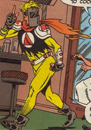 Powers: Hotshot shot fireballs of varying temperature and size from his fingertips, and had some ability in aiming them. He used a customized motorcycle for transport.History: (Hero Hotline #1-6)-William Lefferts was born with the mutant ability to shoot fireballs; his guess is that his mother ate too much spicy food before he was born. He took the costumed identity of Hotshot, and began working for Hero Hotline. He mainly took the job to make his mother Irma happy, but she expects him to make more out of himself one day, like becoming the president of the Justice League. In fact, the biggest obstacle in his super-hero career is Irma, who constantly shows up at Hero Hotline headquarters to nag him or his boss the Coordinator. He adores fellow teammate Diamondette, who mainly finds him useful in lighting her cigarettes. His greatest accomplishment as a hero has been moving out of his parents’ house, and he also aided the team from being taken apart by the Calculator.