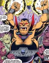 History: (Demon III #34) - Cannibal demon Hyperaktiv ad his brothers tried to plunder Archeron, but failed and were sealed within a giant stone skull. Hyperaktiv told his brothers to flex, and after a thousand years of single-minded flexing and Hyperaktiv berating his brothers they broke free. The brothers wanted to plunder Archeron again, but Hyperaktiv didn’t want to make the same mistake twice. They spotted the demon Etrigan and his allies Lobo, Morax and Harry Matthews, who were on a quest in Hell to save Harry’s soul. Hyperaktiv decided that they looked like a good meal to him, so they ambushed Etrigan and company. Etrigan relished a fight, and gleefully slaughtered the brothers, burning Hyperaktiv to a crisp with hellfire.