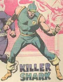 Powers: Killer Shark possesses superhuman strength and is a skilled commando fighter.History: (Blackhawk vol. 1 #269, 270)-General Haifisch was a German general during WWII. He was subjected to biological experiments that gave him superhuman strength, and had special training personally supervised by Adolf Hitler. Hitler thought of him as a model soldier, and Haifisch was given the code-name Killer Shark. Shark was given the mission of capturing a town on the French-Belgium border, but met resistance from the Blackhawks. He captured them all except for Blackhawk and locked them in cells inside his submarine. Blackhawk himself confronted Killer Shark, and they battled on top of the submarine as it surfaced. Shark was knocked into the water, and would not be seen again for several decades.