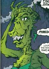 History: (Demon III #51 (fb)) - Lady Smegma once dated the demonic gang leader Rectomm, but left him for hi rival Etrigan. Years after they last saw each other Rectomm met his old gang and fabricated a story about ripping off Etrigan' head and shoving it up his rear for daring to disrespect him. He then broke out in a musical number about when he fell in love with Lady Smegma. Etrigan was nearby, and after hearing him, put a lie to his stories, ripping Rectomm's gang to ribbon and decapitating Rectomm after ripping off his switchblade arm. Smegma saw his "heroics" and fell for him all over again. They made love and he impregnating her in the Sunless Sea from which the Shadow Creature once rose from Hell. His power still resided in the water, and filled the couple's seed and egg, guaranteeing their offspring would be born with immense power.