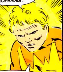 (Legion of Super-Heroes III #5) - The Legionnaires waiting in the space where Orando once was were met by Gigi Cusimano, who recalled them to Earth by orders of the Science Police, and Brainiac 5 protested that the order was irrational. Gigi flirted with Sun Boy, and negotiated with Dream Girl, who convinced her to allow Brainiac 5, Sun Boy, Shadow Lass and Mon-El to stay put should Orando return. Queen Projecta cradled Karate Kid’s charred corpse as the Legion of Sup-Villains surrounded her. Projecta raged at the villains, saying they’d ravaged her planet and killed her husband, and demanded they leave Orando. Nemesis Kid told his teammates to stay back, saying he wanted to be the one to kill her. Light Lass observed the events from Orando from her ship, and, unwilling to see another teammate die, changed course back to the planet. Light Lass charged into battle against the Legion of Super-Villains, but Lightning Lord demanded they leave her be, because she was his sister, and because she’d betrayed him he had the right to kill her. Light Lass almost pitied her insane brother, but after a fierce battle she soundly beat him. The rest of the LSV prepared to attack her when her teammates stranded on Orando came to the rescue, with Element Lad disabling several of the LSV by changing the air around them to helium, causing them to lose consciousness Nemesis Kid told Zymyr to call in the rest of their team as backup, and Projecta assured him she was going to kill him. Element Lad disabled Ol-Vir by turning his clothes to lead, poisonous to Daxamites. The rest of the LSV were soon overwhelmed, and Mist Master, Ron-Karr and Radiation Roy decided the fight was already lost, and boarded Zymyr’s ship, warping themselves back to the space around Orando. Zymyr decided that their dream of finding new worlds to conquer was never to be, and said he would no longer be burdened by humans, and prepared to warp away. His spacewarp accidentally took Light Lass and Lightning Lord with him back to his homeworld Gil’Dishpan. Projecta created illusions of Hell, telling Nemesis Kid that was where he belonged. His power dispelled her illusions, but she Projecta didn’t back down, saying she was the descendant of wizards and kings, and needed only her own strength to finish him. Projecta snapped his neck, and told her stunned former teammates that as queen it was her right to execute a condemned man. The villains aboard Zymyr’s ship crashed and were easily captured by the Legion, and Brainiac 5 hoped to repair the ship to brink back their stranded teammates, but Gil’Dishpan technology defied all known physics and his own super-genius. Projecta held a funeral for Karate Kid, and told her subjects she blamed herself for allowing such evil on her world. The remaining members of the Legion of Super-Villains were contained in one of Zymyr’s spheres, and she instructed the Legionnaires to enter the remaining sphere. Projecta said Orando was ill-suited for modern times and contact with other planets, so she’d use Zymyr’s machine to find new worlds where Orando and her citizens could be left in peace, and told the Legion to never seek her out. Orando warped away, and the Legionnaires hoped their teammates would capture Zymyr and rescue them. Esper Lass sent a telepathic message to the Legionnaires, mocking them. She’d penetrated Zymyr’s mind, and knew how to use his spheres, allowing her to warp herself and her teammates away while the Legionnaires were stranded in their sphere between dimensions.