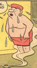 (Challengers of the Unknown I #16) - A man rubbed the lamp to summon the Magic Genie, and was doused with water. The Genie apologized, saying he was taking a bath when he was summoned.