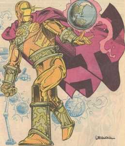 Powers: In his natural gaseous state Manga Khan could communicate telepathically, but couldn't physically interact with anyone or anything. He normally wore an armored suit that made him impervious to damage and granted him superhuman strength. Manga was a very poor fighter and would rather talk his way out of combat. Manga was a master negotiator and barterer, thoroughly lacking ethics in his wheeling and dealings.History: Manga Khan is from the planet Pawsteem, which, during a fly-by of Earth, witnessed Peter Minuit trading $24 in trinkets for the island Manhatten. From that day forward, Pawsteem life became centered on trading and haggling. Manga Khan was a gifted trader from the day of his birth, but despite this his parents traded him to a nomadic starship system called the Cluster. He managed to stage a coup, replacing the entire group with robots and naming himself lord of them all. He soon after acquired an armored battlesuit and employed the robot L-Ron as his right hand man. Manga Khan has had a storied career, doing business across the galaxy, but his favorite planet is Earth. He considers Earthlings the most gullible and greedy species in the universe. He threatened to drain Earth's energy to power the Cluster unless they joined his Cosmic Shopping network, but was foiled by Justice League International. Khan didn't come away empty handed, as he managed to trade L-Ron to JLI.