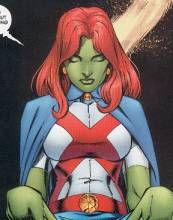 Powers: Like all White Martians. Miss Martian possessed vast superhuman strength, speed and endurance and was a shapeshifter. She disliked her bestial White Martian form, and normally appeared as an attractive green humanoid. She could make herself intangible and invisible, possessed telepathy, flight and Martian Vision, a blast of energy focused through the eyes. She could generate mental psi spikes that caused pain in a target and immobilized them. Miss Martian's main vulnerability was fire.History: Mars had two dominant species, White Martians and Green Martians, and they held a long standing feud that erupted into bloody war. M'gann's parents sent her on a rocketship to the Vega System to save her from the genocide. Years later. the adult M'gann learned of a green Martian, the Martian Manhunter J'onn J'onzz, who'd made a name for himself as a hero on Earth. She traveled to Earth, and assumed a green-skinned humanoid guise like the Manhunter, calling herself Miss Martian and becoming a hero.