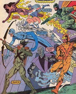 History: (Justice League Quarterly #8)-A group of super-powered villains from the extradimensional planet Qward banded together in hopes of becoming wealthy. They would go from town to town creating disasters, and saving the townsfolk in exchange for an exorbitant price. At this time on Earth, Claire Montogomery was running a membership drive for her New Conglomerate. Her corporate sponsored super-team the Conglomerate was originally scheduled to face their rivals the Justice League in a pay-per-view charity event for UNICEF. The Justice League’s benefactor Maxwell Lord decided to undermine Claire by hiring away all the individual team members into lucrative contracts in the entertainment industry. Claire had no luck finding adequate replacements until she met Norman the Doorman, who had the ability to open up dimensional rifts. He showed her the villains from Qward, and she mistook them for super-heroes when she witnessed them rescuing a village from the effects of a volcano. After they were brought to Earth she explained the situation and they agreed to become the New Conglomerate. In truth they were only playing along with Claire in order to get a taste of Earth’s greatest heroes and determine if world domination was feasible. At the pay-per-view event they went from cheating against the Justice League to blatantly attacking them. They had made up their mind that ruling the world would be easy, and they would begin by killing the League. At this point Norman realized his mistake and helped banish the New Conglomerate back to Qward. Despite the very positive reaction from the viewers, the New Conglomerate has yet to be brought back to our world.