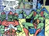 Powers: The Outsiders were a reptilian race that needed liquefied air to breathe. They were technologically advanced, and possessed spacecrafts, timewarps and ray-guns. Outsiders possessed the power of flight and could drain the will of whoever they looked at, turning them into slaves.History: (Sea Devils #32) - <2166> The Outsiders arrived on Earth bent on enslaving the planet. After a show of military force they began draining the Earth’s oceans, and pumped the water into the atmosphere to create liquefied air and an environment in which they’d thrive. They enslaved a number of humans using their will-sapping powers, but an underground resistance still existed. Their plans hit a bump when the remaining seas were too salty to be properly drained. The Outsiders researched the planet-stone, an extraterrestrial object that landed on Earth that could desalinify water. It was last recorded as being put in a time capsule centuries ago, so they sent three of their human slaves into a timewarp to retrieve it. The slaves found the planet-stone, but were opposed by the Sea Devils, who hitched a ride with them into the future. The Outsiders tried to kill the Devils, but they fled and met Luv-El, a member of the human resistance. The Outsider’s tyrant prepared to use the planet-stone, but was halted by Luv-El, and the Devils, who blasted him with a ray gun and took back the stone. The Devils returned to their own time with the Outsider’s timewarp, and shot the planet-stone into space so the Outsiders couldn’t use it against humanity in the future.