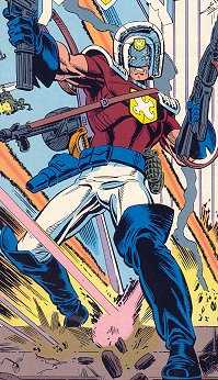 (Vigilante I #36-38) - Valentina Vostok ran the secret government Agency despite orders from the President to disband. She employed Peacemaker, who went off the reservation to take on the Lebanese People's Liberation Army. who'd hijacked a plane in NY. General Peterson told her Peacemaker was mentally unstable believing the souls of those he killed entered his helmet and having arguments with them, and a liability who should be taken care of. Peacemaker boarded the plane, shooting three of the terrorists, but Vigilante, who'd heard about the situation on the police band, arrived to make sure Adrian Chase, his predecessor who was on the plane, was okay. He grabbed Peacemaker, not knowing if he was one of the good guys or not, and Peacemaker flipped out, shooting him to death before departing. Adrian blamed himself, and took on the mantle of Vigilante again to kill Peacemaker. One terrorist Jhamed, escaped in the confusion, and Peacemaker went looking for him. Valentina tried to cover up Peacemaker's actions, and when her agents spotted Adrian wearing the Vigilante mask she decided to take care of him if he compromised her Agency by going after Peacemaker. Valentina sent Agency members in a helicopter to retrieve Peacemaker, but he shot them down, and debated killing Valentina if she kept interfering in his mission. Jhamed was set to leave on a ship, shielded by terrorist allies, and Valentina had recruited Vigilante and his ally Lt. Stein to help with the Peacemaker situation. Vigilante went in blasting, killing a number of the terrorists, and Valentina chastised him, saying that Peacemaker would never show up during such carnage. She was wrong, as Peacemaker was present, and believing she brought Vigilante there to kill him he pointed a gun at her, and Vigilante drew his gun on him. Stein reminded them that they still ahd terrorists to deal with, and Vigilante and Peacemaker begrudgingly teamed up to systematically kill them. Jhamed fled the ship, and after an argument Vigilante killed him. Peacemaker was furious that Vigilante took what he saw as his kill, and they started brawling. A journalist was nearby, and recorded the fight. Peacemaker unmasked Vigilante, and Adrian Chase's secret identity was broadcast to the world. Valentina's agents broke up the fight with a hail of bullets, but both men slipped away, vowing to continue their fight to the death another time.