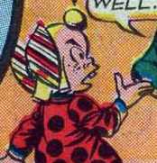 (Flash Comics #73) - Thunderbolt and his wife were playing pool, and Mrs. Thunderbolt asked her husband to bring Shocko to work with him because he was getting to be a handful for her, and she couldn’t get him out of the house because the other 5th Dimensional children wouldn’t play with him. Johnny said the magic word, and Thunderbolt relented, bringing his son to work, even though he complained Johnny was enough of a pain for him while he was trying to get things done. Johnny built a dollhouse for Peachy Pet’s birthday, but managed to get his head stuck between two planks of the roof, and was in danger of choking to death before Thudnerbolt freed him. Shocko took the distraction as an opportunity to sneak away, wanting to go to Peachy’s birthday party instead of returning to the 5th Dimension. He thought the party’s magician was boring so he turned into a giant rabbit and stuffed him in his own top hat, alarming the children at the party. Thunderbolt chased his son back home, and Peachy’s friends all said they were never coming over her house again. During all the commotion Johnny managed to get his head caught in the dollhouse again.