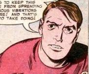 (Challengers of the Unknown I #3) - Professor Curtis showed the Challs a film of a monkey playing in fire with no ill effects and told them the monkey had ingested a chemical from a meteor that landed on Earth and gained the ability to withstand extreme environments. The chemical was not ready to be tested on humans, but Rocky insisted on volunteering. He took the chemical, and went up in a rocketship to see if he could survive reentry. During his flight the monkey lapsed into a coma, and Curtis feared the side effects the chemical would have on a human. Rocky survived the heat friction of reentry and gained fantastic powers, changing size, and generating intense heat and cold, but was unhinged, and fled after attacking his teammates. Rocky went into the woods, and the Challs organized a search party. Rocky stumbled on the cabin of gangster Chopper and his gang, and Chopper, seeing potential in his powers, decided to use him as a pawn committing crimes. The Challs found them, and when Chopper shoved June Rocky came to is senses and took out the criminals. The chemical wore off, and Rocky lost his powers and his mind returned to normal.