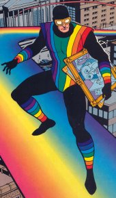 History: (Flash I #286) - Roy was a child prodigy, a painter of great artistic genius. Unfortunately, he was born color-blind and could never realize his full potential. Roy's father, a world-renowned optometrist, spent his life trying to create an optical device that would allow Roy to see in full color. On his deathbed he gave Roy a pair of “prisma-goggles” that he hoped would compensate for his son’s handicap. Roy found that his color blindness was still uncured, but he now had incredible powers over colored light. He resented the fact that his vision prevented him from fully appreciating great works of art, so he created the identity of the Rainbow Raider and used his powers to steal paintings so no one else would be able to appreciate them either. He made his debut robbing the Centrex Museum, disabling the security guards with a burst of blue light that left them sobbing uncontrollably. Flash (Barry Allen) responded to the robbery, and the Raider was elated that his debut was attracting so much attention. He hit Flash with black light, draining all the color from his body and enervating him. Rainbow Raider was convinced he’d already hit the big-time since he got away from the Flash. Back at home Barry did some research on the nature of color and light and realized Rainbow Raider’s black light saturated him with radiation that prevented him from reflecting light. Barry was late to work, and got reprimanded by his superior Darryl Frye, but when he saw a news story about the opening of the Skytop Art Gallery he left work and changed into the Flash, betting the Raider couldn’t pass up the opportunity to rob another art gallery. Raider used red light to turn the soirée into a brawl, and flew off on his rainbow. Flash ran up his rainbow, but Raider blinded him with light, causing him to fall to the city streets. Flash vibrated his molecules so the impact wouldn’t hurt him when he landed on a car below, and passing through the green car turned him green. Flash sped through a junkyard, vibrating through a number of objects until all his colors returned to him. Raider confronted him, but Flash kicked up dust into his eyes and stole his goggles, leaving him powerless and defeated.