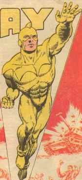 History: In 1940 a secret government agency named RONOL (Research on the Nature of Light) tricked “Happy” Terrill was covering the ascent of Professor Styne’s “strato-balloon” into the upper atmosphere. “Happy” accompanied Styne in its passenger cabin while RONOL released a light bomb that manifested as a strange and powerful electrical storm. “Happy” was bombarded with large amounts of electric energy, but survived, gaining amazing powers and taking the costumed identity of the Ray.