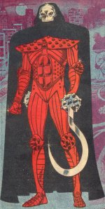 Powers: The Reaper is a masterful acrobat and hand-to-hand combatant. He wears studded leather body armor designed not only to protect him, but also to injure anyone assaulting his person. He primary weapons are a pair of razor-sharp scythes which also contained guns in their spiked grips.History: (Secret Origins vol. 2 #50)-Years ago in Gotham City a burglar shot Judson Caspian and his wife Mary. Mary died, and Judson was crippled for years. When he recovered he vowed revenge and took up the costumed identity of the Reaper. The Reaper mercilessly stalked and slaughtered criminals, resulting in Gotham City having one of the lowest crime rates in the country. Months later Gotham’s protector of the 1940’s, Green Lantern I decided to come out of retirement to confront the Reaper. The ensuing fight left Green Lantern in the hospital, and the Reaper being pursued by the Justice Society. At this point he considered his work done; he retired and emigrated to Europe.