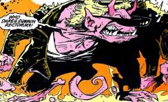(Demon III #51 (fb)) - Rectomm replaced his severed arm with an enormous switchblade, and after meeting his old gang fabricated a story about ripping off Etrigan' head and shoving it up hi rear for daring to disrespect him. He then broke out in a musical number about when he fell in love with Lady Smegma. Etrigan was nearby, and afterhearing him, put a lie to his stories, ripping Rectomm's gang to ribbon and decapitating Rectomm after ripping off his switchblade arm.