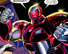 Powers: Ricochet wore a battlesuit that gave him superhuman strength and durability. The suit projected a forcefield, and his gauntlets housed energy guns.