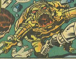 Powers: The Rock-Buster possesed superhuman strength and durability, and could generate enormous amounts of electricity.History: (Kamandi #3) - The Rock-Buster was a silica-based lifeform native to Earth's moon. The Apollo 20 mission brought its egg to Earth, and it was stored in a Nevada NASA museum. During the period of its storage the Great Disaster occurred, deevolving most of humanity into feral savages, and allowing animals to involve intelligence. The Rock-Buster hatched and wrecked havoc in its now underground lair, killing members of the Gorilla-Men that scavenged and excavated the area. Ben Boxer and Renzi, human mutants and descendants of NASA scientists, explored the site to get clues to their own origins. The Rock-Buster instinctively attacked them, and they chased each other through the tunnels when they met up with Kamandi, the last boy on Earth who was fleeing his gorilla captor Chaaku. Chaaku and the Rock-Buster engaged in mortal combat, resulting in both their deaths as the underground tunnels collapsed around them.