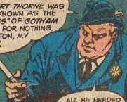 (Detective Comics I #475, 476) - The city council pressured Thorne, wanting to know what plans he had for Batman, since Gordon and the GCPD were openly defying their orders not to work with the vigilante. Joker dropped in on Boss Thorne in the city council bathroom, saying he knew he was at the auction for Batman’s identity. Joker said he suspected Hugo Strange was dead, and Thorne didn’t know who Batman was so Joker wouldn’t have to kill him. Thorne was astonished that Joker, like Strange, wanted Batman all to himself. Joker said he, and he alone would find out who Batman was and be the one to destroy him. Thorne ran from the bathroom screaming. After the pressure he was under being haunted by Strange, Joker’s visit was the last straw, and Thorne hopped in his car and headed to the west coast. Silver St. Cloud was also fleeing Gotham, conflicted about telling her boyfriend Bruce Wayne she knew he was Batman. Her car broke down, and Thorne saw her on the side of the road. Silver asked him for a ride and jumped in. A news report about Batman came on the radio, and Thorne bashed the Caped Crusader, saying he was responsible for all Gotham’s problems. Silver shot back that Batman kept the city safe from corrupt people like Thorne, who’d been grafting off the city for years. Thorne said he demanded respect, and when Silver refused to back down he ordered her out of his car. Thorne spotted Hugo Strange on the side of the road, and the apparition jumped out at him, saying his time was through. Thorne wasn’t physically harmed, but he suffered a nervous breakdown. The state patrol picked him up and he confessed to every crime he’d ever committed, and admitted he’d been the one responsible for turning the city council against Batman.