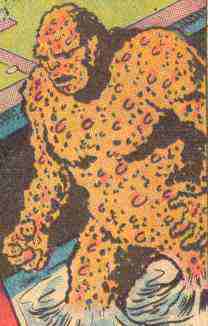 Powers: Sponge-Man can absorb any amount of color, sound, heat, oxygen or water from a surrounding area, and he can also drain off an opponent's vitality. The more substances Sponge-Man absorbs, the larger and stronger he becomes. There is no known limit to the amount of substances Sponge-Man can absorb into his body, but he can also release any substance he has absorbed back to its' original source.History: (Challengers of the Unknown vol. 1 #47)-Miklos was a deep-sea sponge-diver who came upon a strange meteorite with a sponge growing on it. Accidentally cutting himself on the meteorite, he soon found himself imbued with its' energies, and became a Sponge-Man. He sought the help of the Challengers of the Unknown to cure his condition, and they promised to find a cure. Unfortunately his next-door neighbor, a former con named Stacy, was eavesdropping and dreamed up a scheme to manipulate him. Stacy concocted a story about a foreign doctor who could cure him, but saying the treatment would cost a small fortune. Although reluctant to the suggestion, Sponge-Man consented to help Stacy rob an armored truck, and later steal a Rembrandt being transported on a cargo ship. The Challengers confronted Sponge-Man and presented him with Stacy's rap sheet. Angry at being used, and feeling full of despair, he began wandering the countryside in a daze, absorbing everything in his path and growing to colossal proportions. He snapped out of it when he witnessed a forest fire endangering the lives of small children, and released enough water to put out the blaze. The Challengers again offered their help to him, but Sponge-Man decided he no longer had a place in human society. Sponge-Man dove to the bottom of the sea, sat on a rock, and prepared himself for a lifetime of solitude.