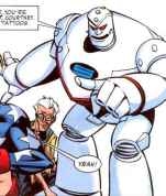 (JSA #81) - Pat and his son Mike worked on the S.T.R.I.P.E. suit, and despite Mike’s arguments Pat told him he still wasn’t ready to go on superhero missions. S.T.R.I.P.E., Stargirl and the JSA were called to Philadelphia when Liberty Belle lost control over her powers after an attack by the Society. Stargirl showed her that her daughter Jesse was there, and was worried about her mother. This allowed Belle to focus and regain the use of her powers. Shae informed Stargirl of the death of her biological father Sam Kurtis and she burst into tears. She couldn’t understand why she still cared for a criminal who’d only done her wrong, but STRIPE told her it was because she was a good daughter.