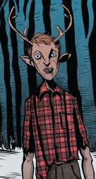 History: (Sweet Tooth #1, 10 (fb), 22 (fb)) - A disease ravaged the U.S., turning it into a wasteland and leading to children being born with animal features. The sickness plagued the country, with most non-hybrid children getting sick and dying. Richard Faunin took the newborn Gus, who was born with deer antlers to a wilderness sanctuary. He told Gus the sickness took Gus’ mother soon after he was born, and his Richard kept his sanity by talking to God. Richard started writing his own bible, believing that God spoke directly to him. He believed mankind’s sin had brought plague on the world, a punishment from God, but God created Gus as the first of a new race that would be pure in the eyes of God. Faunin ended his Bible with his own Book of Revelations, which consisted mostly of drawings of animal totems on page after page and Tekkeitserktock, an apocalyptic figure that he lived in dread of. Tekkeitserktock was a grizzled older man with white hair and scars on his face. He taught Gus how to survive in the woods, and warned Gus never to leave, telling him there was nothing besides hellfire beyond the trees. Richard was worried about hunters who captured and sold animal hybrid children, and warned Gus that he would always have to be on his toes, and he’d have to hide if he ever saw another living being. The sickness began affecting Richard’s health and he began wasting away. His sleepless nights were spend talking to God. Gus began finding candy bars around the reserve, and his father warned him that it was probably a hunter’s trick. He admitted that he didn’t have much longer to live, and soon Gus would have to take care of himself. After a long winter Richard died, and Gus buried him next to his mother. Hunters found Gus, and wondered how much they’d get for him, but he was rescued by the hunter Jepperd, who shot one of his tormentors in the head.