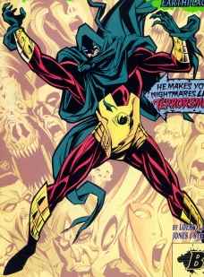Powers: Terrorsmith can temporarily transform any human he touches into a monster possessing superhuman strength, speed or a number of other superpowers. A transformed victim usually takes on the form of their own worst nightmare, and the shock of the physical transformation sometimes kills them. Terrorsmith has little control over his creations.History: (Justice League America Annual #7)-Jack Mobley was a relatively successful computer programmer, but he could never get along with others and found his career going downhill. His wife accused him of blaming other people for his problems and left him, taking their daughter with her. Soon after he was diagnosed with terminal pancreatic cancer. Jack's life would get even worse when he was attacked by Lissik and Venev, two of the Space Parasites. Jack was among the small number of Parasite victims that survived the attack, having his metagene activated and gaining superhuman powers. His new horrific appearance caused panic in everyone he came across, and he found himself in the middle of a hostile mob. Even worse, anyone coming in contact with him was transformed into a gruesome monster. This brought the attention of Justice League America, and Jack fled to his ex-wife's house. He killed her new husband and begged her for reconciliation. She refused, so he transformed her into a monster. Suddenly accepting his fate, Jack decided to become a supervillain. Fashioning a costume, he named himself Terrorsmith and assembled a small army of his creations. He blamed the JLA for what he had become, and demanded his monsters find and kill them. The monsters fled from him, wanting no part of his plan. He broke down in tears as Wonder Woman II arrived on the scene. She talked Terrorsmith into giving himself up, and he even aided the JLA in combating the Space Parasites. Terrorsmith was last seen riding away on a bus, contemplating whether to use his powers for good or evil.