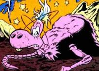 (Demon III #43, 44) - Etrigan threw a hottub party in the firepits of Hell to celebrate his new job as hitman of Hell with his friends Morax, Baytor, Lord Kakk, Bloodklott and Poppinjay, promising to use his newfound clout to kill any of their enemies. Etrigan hooked up with his ex Lady Smegma, and she was pleased to announce that she was pregnant. Etrigan was overjoyed, telling her they'd use their child to utterly destroy his human host Jason Blood. The Thing-That-Cannot-Die snuck into Etrigan's cloak, hitchhiking with him back to the earthly realm, but was soon discovered. Demon shoved the Think into a microwave and cooked him for putting him in a bad mood, even though Thing protested that he only snuck back from Hell with Etrigan because he'd stranded him there in the first place.