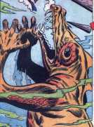 Powers: Valdo possessed superhuman strength and durability, and was aquatic.History: (Sea Devils #29) - Valdo was an undersea monster kept by the Golden People to test those who wished to be king of their people. A fissure exposed the Golden People’s undersea kingdom, and the Sea Devils investigated. The Golden Goddess desired Sea Devil Dane Dorrance to be her king, and forced him to take the test of the kings. Dane wanted no part of it, but she forced him into a tank to fight the dragon-like monster Valdo. Dane tossed a spear into the monster’s mouth, wounding it, and it fell into the tank’s spikes, impaling itself. The Goddess told Dane he’d passed, and she’d give him time to say goodbye to his friends before she executed them and made him her king.