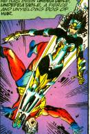 (Jack Kirby’s Fourth World #11, 12) - During the upheaval caused by the separation of New Genesis and Apokolips, massive firepits formed on the surface of Genesis, wrecking the poles. Valkyra’s retreat was destroyed, and the earthquakes unleashed a weapon of the Old Gods, an energy beast that took on the properties of the warriors it subsumed. The beast caught Valkyra unaware, rare for her, and she was trapped inside it. Orion traveled to the south pole of New Genesis to see if his mentor Valkyra still lived. He was confronted by the energy beast, who made an armored body of the remains of Valkyra’s citadel, but Orion dissipated it with his mother box. Orion was pleased that his teacher was still alive, and they reminisced about old times. Valkyra admitted that as she watched Orion grow up, she fell in love with him. Orion could not resist the rare feeling of love that swelled inside him, and he embraced her and kissed her. They spent the night together, and both of them realized how complete they felt. Lightray arrived at the pole, worried about Orion, but when he realized the glorious situation, that Orion was in love, he assured the couple he’d give them some peace, and that New Genesis could handle itself without Orion for some time.