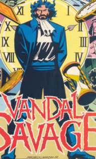 History: (Green Lantern I #10 (fb), History of the DC Universe #1, Time Masters #8) - 50,000 years ago Vandar Adg was born into the Blood People, a tribe of Cro-Magnons. Time traveler Rip Hunter knew that Vandar would one day become a great force of evil, and hoped to prevent his rise to power by killing him. Hunter mistakenly killed Vandar's father, traumatizing the young Cro-Magnon. Years later a strange meteor fell from the sky close to Vandar. He lapsed into a coma, and upon awakening found himself transformed into an immortal. Now known as Vandal Savage he embarked on a quest for power that would last millennia. Through the years he continually warred with another man who had been given powers by the same meteor, the Immortal Man. In the dying days of Atlantis Savage founded the Illuminati.