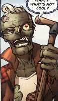 History: (Welcome to Tranquility #2) - Zombie Zeke was an undead horror host who spoke in ghoulish puns. He retired to Tranquility, a community for elderly superheroes and supervillains of yesteryear. Mr. Articulate was fatally stabbed with his own swordcane during a scuffle between Sheriff Lindo, the former members of the Liberty Squad and Emoticon and his entourage at the Chick’n Go. Who the murderer was wasn’t evident and Sheriff Lindo was determined to find the culprit. Articulate’s formerly Liberty Squad friends Mayor Fury, Colonel Cragg and Bad Dog met Zeke to arrange Articulate’s funeral. They were in no mood for Zombie Zeke’s shtick and just wanted him to assure them they’d give an honorable funeral for their their friend. The entire community of Tranquility turned out for the service